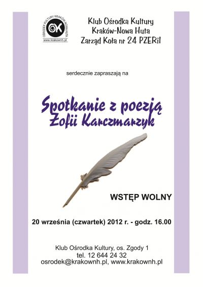 Klub Oœrodka Kultury Kraków-Nowa Huta (os. Zgody 1) zaprasza 20 wrzeœnia 2012 r. (czwartek) o godz. 16.00 na popołudnie z poezjš.