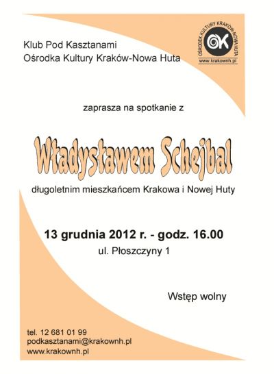 Zapraszamy do Klubu Pod Kasztanami Oœrodka Kultury Kraków-Nowa Huta na spotkanie z panem Władysławem Schejbal, który opowie o swoim długim i ciekawym życiu. A wszystkie te opowieœci okraszone będš szczyptš humoru.