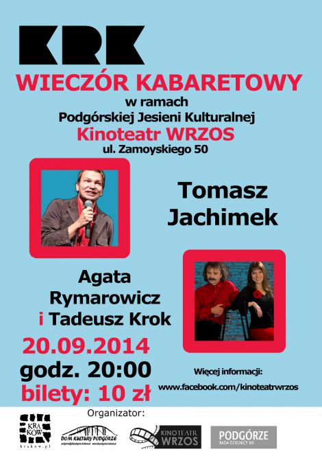 W cyklu imprez w ramach Podgrskiej Jesieni Kulturalnej nie zabraknie miejsca take na muzyk. 20 wrzenia na scenie Wrzosu zaprezentuje si duet muzyczny Agata Rymarowicz i Tadeusz Krok. Nie porzucamy jednak do koca kabaretowych klimatw Tomasz Jachimek take zabynie tego wieczoru na deskach kinoteatru. Zapraszamy na Wieczr Kabaretowy.