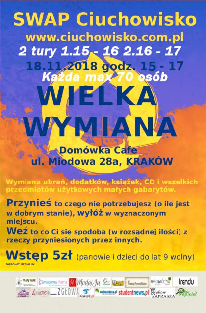 Kolejna edycja szalonej wymiany ubra i dodatkw czyli Krakowskiego Ciuchowiska ju 18 listopada (to ta wolna niedziela:) ). Widzimy si ponownie na Kazimierzu w Domwka Cafe (ul.Miodowa 28a).