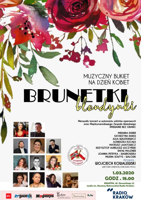 BRUNETKI, BLONDYNKI...- muzyczny bukiet na Dzie Kobiet to koncert w wykonaniu Midzynarodowego Zespou Integracji Wokalnych oraz solistw operowych takich jak: Krzysztof Aureliusz uczyski (Den Norske Opera w Oslo), prof. Rafa Majzner, Julia Iwaszkiewicz, Miranda Exner, Milena Sotys - Walosik, Joanna Petryka-Wawrowska (Niemcy) czy Katarzyna Haras - przy akompaniamencie pianisty Mateusza Lasatowicza.