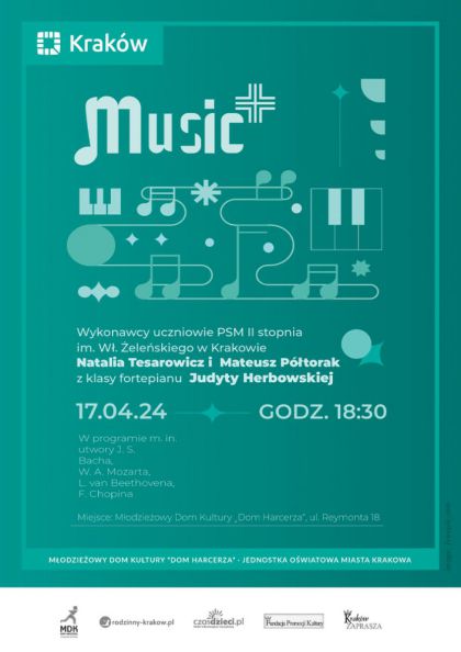 Serdecznie zapraszamy! 17 kwietnia, godz. 18.30 do MDK "Dom Harcerza" na koncert z cyklu Music +. Wykonawcami konkursu są uczniowie PSM II stopnia im. Wł. Żeleńskiego w Krakowie