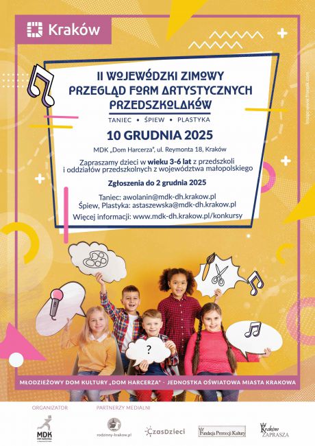 Młodzieżowy Dom Kultury „Dom Harcerza” Reymonta 18 w Krakowie zaprasza dzieci w wieku 3–6 lat z przedszkoli i oddziałów przedszkolnych województwa małopolskiego do udziału w II Wojewódzkim Zimowym Przeglądzie Form Artystycznych Przedszkolaków.