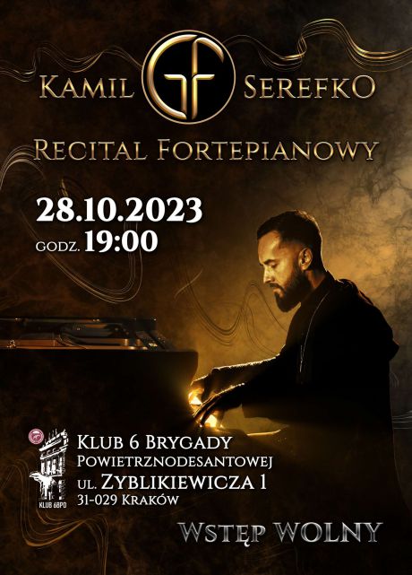 Serdecznie zapraszamy wszystkich miłośników muzyki fortepianowej na recital w wykonaniu Kamila GF Serefko, który odbędzie się w dniu 28 października br. o godz. 19.00 w Klubie 6 Brygady Powietrznodesantowej przy ul. Zyblikiewicza 1.