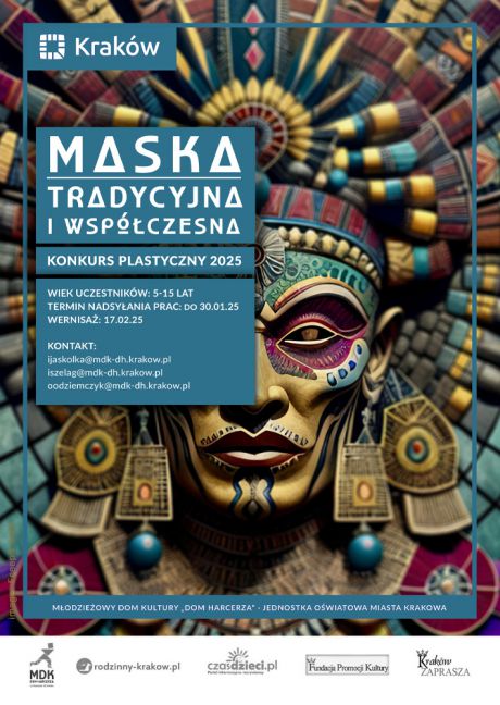 Młodzieżowy Dom Kultury „Dom Harcerza” przy ul. Reymonta 18 w Krakowie zaprasza dzieci i młodzież w wieku 5–15 lat do udziału w wyjątkowym konkursie, którego tematem jest maska jako środek ekspresji plastycznej i emocjonalnej.
