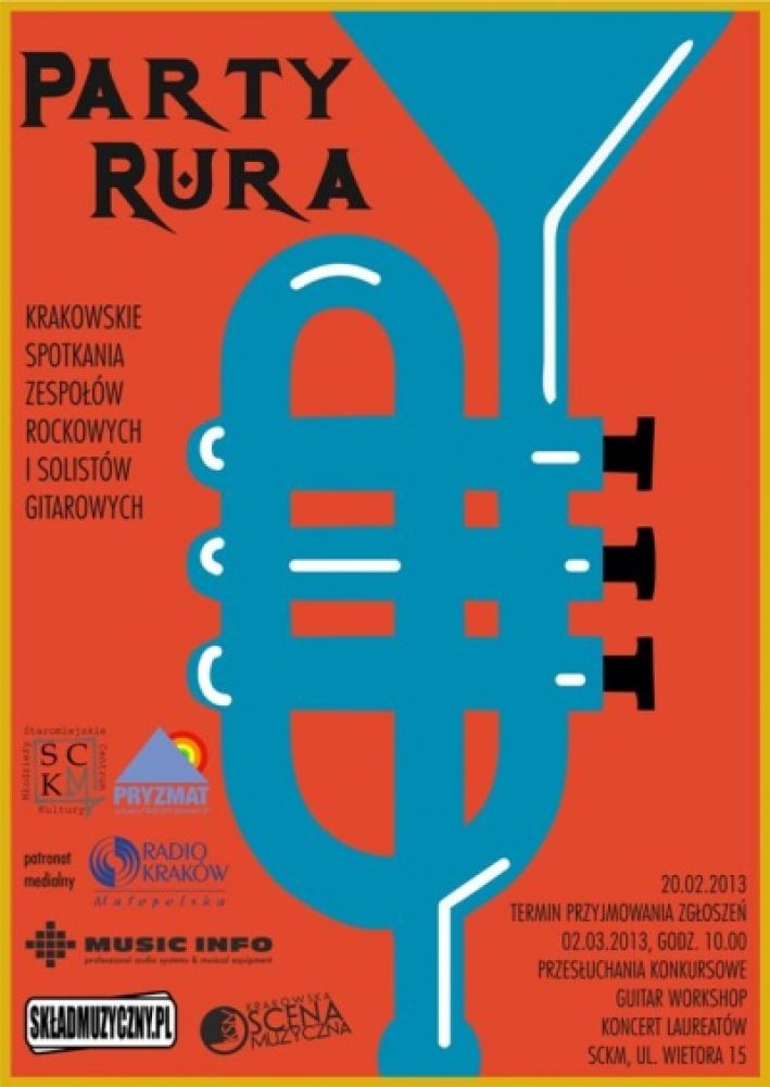 Staromiejskie Centrum Kultury Młodzieży zaprasza do udziału w Krakowskich Spotkaniach Zespołów Rockowych i Solistów Gitarowych PARTY RURA, które odbędš się 2 marca 2013 na scenie SCKM ul. Wietora 15.
