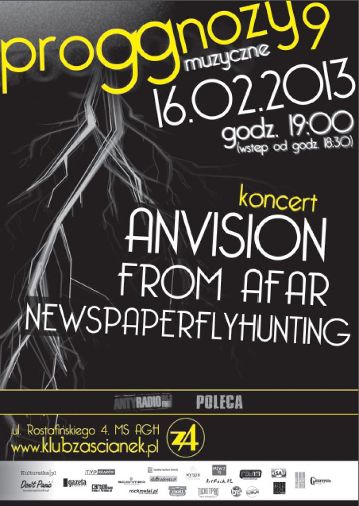 AnVision na scenie towarzyszyć będzie From Afar - grupa powstała w 2005 roku. Następne lata działalnoci to poszukiwania optymalnego składu i rozwój artystyczny, który zaowocował w 2012 roku debiutanckš EPkš The Abyss Gazes Into You. From Afar w swej twórczoci oscyluje między rockiem i metalem nie unikajšc jednak momentów delikatniejszych i silniej lirycznych. 16 lutego na scenie Zacianka zaprezentuje się również Newspaperflyhunting - białostocka formacja grajšca melodyjnš muzykę z pogranicza postrocka i rocka progresywnego. Historia zespołu sięga 2006 roku, debiutancki album długograjšcy, no12listen, wydany został natomiast w roku 2011.