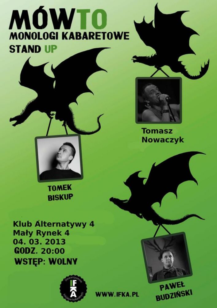 Tradycyjnie zapraszamy na STAND UP i MONOLOGI KABARETOWE w wyknaniu trzech komików, a imprezę kończymy Waszymi występami w ramach OPEN MIKE'A - każdy z Was, kto ma ochotę przedstawić swój fragment stand up'u, dostanie swoje 5 minut na scenie!