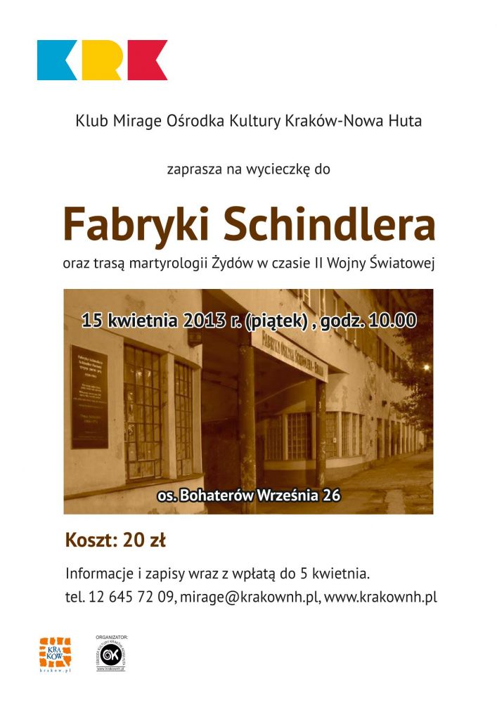 Klub Mirage Orodka Kultury Kraków-Nowa Huta zaprasza do wspólnego zwiedzania z przewodnikiem dawnej Fabryki Naczyń Emaliowanych Oscara Schindlera oraz przejcia trasš martyrologii Żydów w czasie II Wojny wiatowej. Zapisy wraz z wpłatš przyjmowane sš w Klubie do 5 kwietnia.