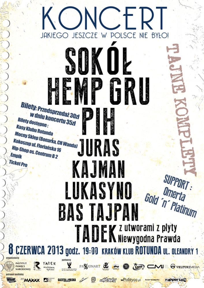 Takiego wydarzenia w Krakowie(a miemy twierdzić, że w Polsce również) jeszcze nie było.Koncert Tajne komplety to również rekord w dziedzinie nowatorskich lekcji historii. Sam zestaw wykonawców to komplet bogatszy od tych spotykanych na kilkudniowych festiwalach. Podczas koncertów będš wywietlane na dużym ekranie prezentacje przygotowane przez IPN, Muzeum AK i samych artystów. W oprawie orkiestry kameralnej, sekcji rytmicznej i chóru Filharmonii krakowskiej zostanš wykonane utwory z płyty Tadek "Niewygodna Prawda.