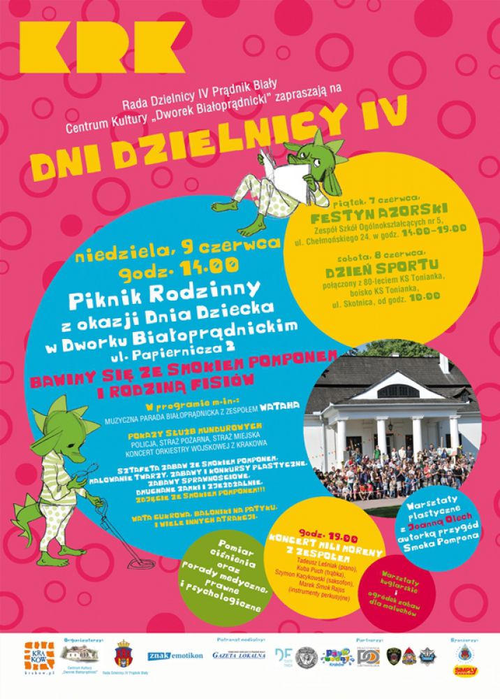 Całoœć wydarzeń otworzy Muzyczna Parada Białopršdnicka z zespołem WATAHA – The Slavic Drummers. Potem będzie można już tylko wybierać między wieloma ciekawymi propozycjami: malowaniem twarzy, sztafetami zabaw dla całych rodzin, czy warsztatami kuglarskimi. Nie zabraknie również uwielbianych przez dzieci pokazów służb mundurowych: policji, straży pożarnej i straży miejskiej oraz koncertu krakowskiej Orkiestry Wojskowej. Goœciem specjalnym imprezy będzie Joanna Olech, autorka przygód Smoka Pompona, która poprowadzi warsztaty plastyczne dla najmłodszych.Piknik będzie również doskonałš okazjš do zaczerpnięcia porad specjalistów z dziedziny prawa, medycyny i psychologii.