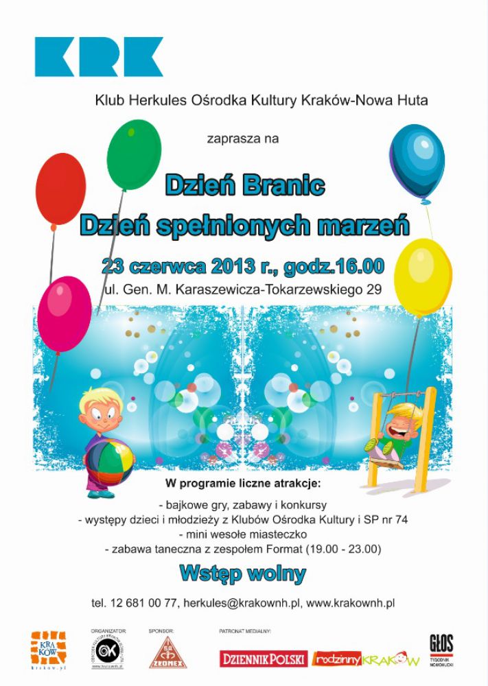 Rodzinna impreza plenerowa dla mieszkańców Branic i wszystkich tych, którzy chcieliby poznać to krakowskie osiedle. W programie wydarzenia znajdš się m.in.: występy dzieci i młodzieży, bajkowe gry, zabawy i konkursy z nagrodami. Nie zabraknie także tradycyjnych festynowych atrakcji: malowania twarzy, mini wesołego miasteczka, stoisk gastronomicznych czy kramów z zabawkami i słodkoœciami.