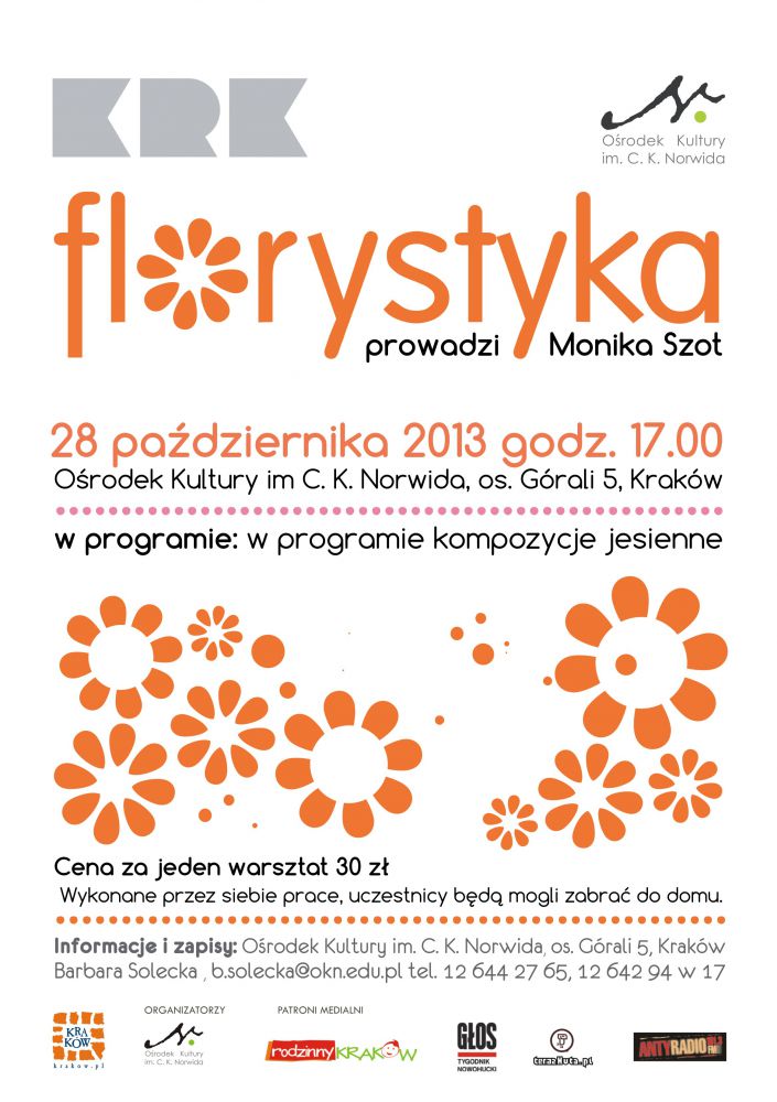 Prowadzi florystyka Monika Szot. - dyplomowana florystka, która swojš pasjš do kwiatów potrafi zarazić wszystkich dookoła. Warsztaty pozwolš zdobyć umiejętnoœci tworzenia różnorodnych kompozycji z kwiatów, dekorowania stołu i pomieszczeń. Zapoznajš uczestników z zasadami kompozycji, pozwolš poznać różnorodne możliwoœci użycia materiału roœlinnego, doboru kolorów, dodatków i innych elementów decydujšcych o efektownej dekoracji florystycznej.