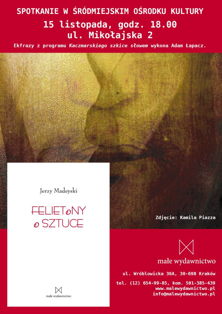 Jerzy Madeyski (1931-2005) był w Krakowie postaciš legendš, człowiekiem pełnym radoci i entuzjazmu. Zabiegali o jego słowo na wernisażach zarówno właciciele galerii, jak i współczeni twórcy. Już sama obecnoć Jerzego Madeyskiego na wystawie podnosiła rangę wydarzenia. Dużo pisał, a najciekawsze teksty zamieszczał w prasie codziennej. Na czytelnikach robiły ogromne wrażenie, jednak szybko znikały w stercie codziennych gazet. Pan Jerzy niestety nie przywišzywał większej wagi do tego, by swe artykuły gromadzić w cykle i udostępnić w formie ksišżki. Udało się to Januszowi Paluchowi i Małemu Wydawnictwu.