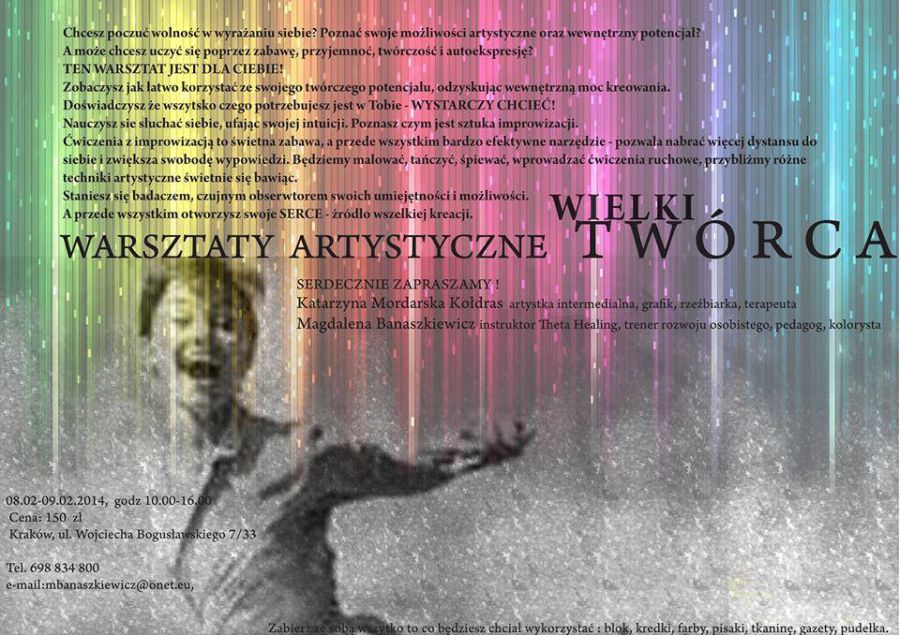 Chcesz poczuć wolnoœć w wyrażaniu siebie? Poznać swoje możliwoœci artystyczne oraz wewnętrzny potencjał? A może chcesz uczyć się poprzez zabawę, przyjemnoœć, twórczoœć i autoekspresję? TEN WARSZTAT JEST DLA CIEBIE! Zobaczysz jak łatwo korzystać ze swojego twórczego potencjału, odzyskujšc wewnętrznš moc kreowania. Odkryjesz że wszytko czego potrzebujesz jest w Tobie. WYSTARCZY CHCIEĆ! Nauczysz się słuchać siebie, ufajšc swojej intuicji.Poznasz czym jest sztuka improwizacji. Ćwiczenia z improwizacjš to œwietna zabawa, a przede wszystkim bardzo efektywne narzędzie – pozwala nabrać więcej dystansu do siebie i zwiększa swobodę wypowiedzi. Będziemy malować, tańczyć, œpiewać, wprowadzać ćwiczenia ruchowe, przybliżmy różne techniki artystyczne œwietnie się bawišc. Staniesz się badaczem, czujnym obserwatorem swoich umiejętnoœci i możliwoœci. A przede wszystkim otworzysz swoje SERCE – Ÿródło wszelkiej kreacji.