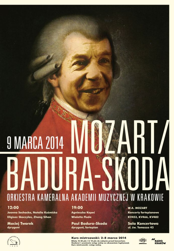 Niedzielę 9 marca okreœlić można w kalendarzu koncertowym Akademii Muzycznej dniem fortepianu. Odbędš się wówczas dwa koncerty, podczas których studenci (Joanna Sochacka, Natalia KuŸmicka, Eligiusz Skoczylas, Zhang Sihan, Agnieszka Kopeć oraz Wioletta Fluda)z towarzyszeniem Orkiestry Kameralnej Akademii Muzycznej wykonajš Koncerty fortepianowe Wolfganga Amadeusza Mozarta: G-dur KV 453, d-moll KV 466, Es-dur KV 482. Koncert o godzinie 12:00 poprowadzi Maciej Tworek, natomiast wieczorem o godzinie 18:00 dyrygować będzie Paul Badura-Skoda. Możliwoœć konfrontacji różnych wykonań tych samych utworów w jednym dniu i w tym samym miejscu, którym będzie Sala Koncertowa Akademii Muzycznej, stanie się z pewnoœciš niecodziennym i ciekawym doœwiadczeniem.