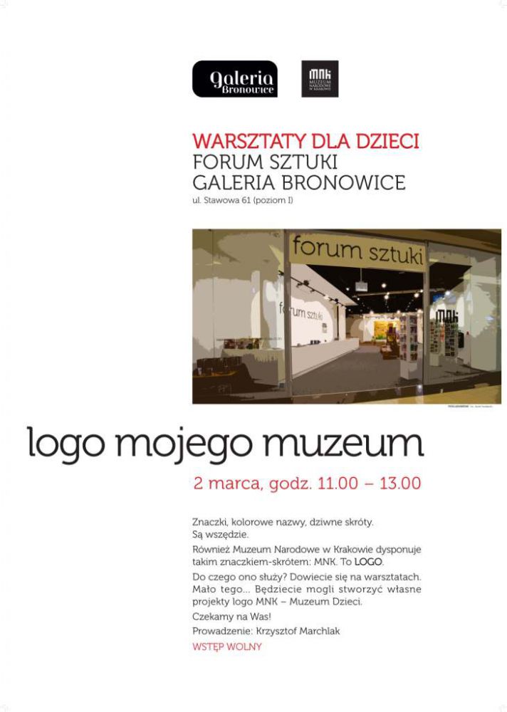 Serdecznie zapraszamy na bezpłatne warsztaty dla dzieci pt. LOGO MOJEGO MUZEUM, które odbędš się w najbliższš niedzielę, 2 marca, godz. 11.00-13.00, w Forum Sztuki, lokalu Muzeum Narodowego w Galerii Bronowice.