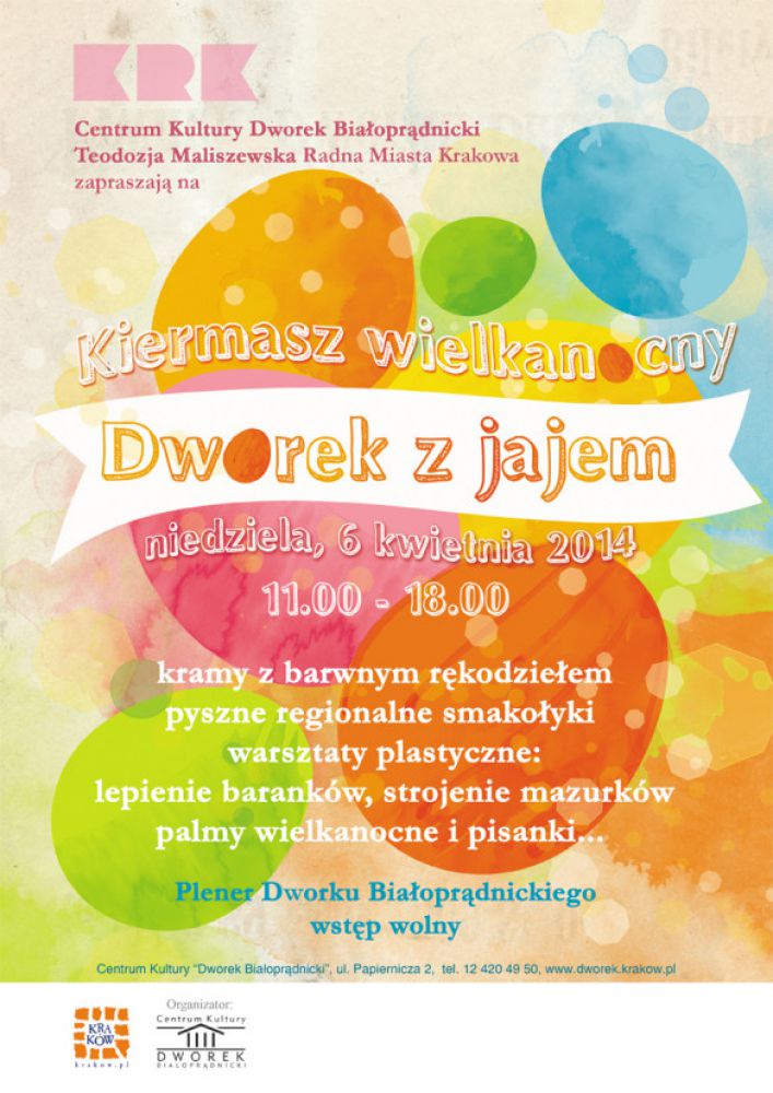Poczšwszy od godziny 11:00 plener Dworku Białopršdnickiego należeć będzie do wystawców prezentujšcych przepiękne wyroby rękodzielników, rzemieœlników i twórców ludowych. Pojawiš się stroiki wielkanocne, koszyki, œwieczki, pisanki, obrusy œwišteczne, wyroby regionalne… Na stoiskach nie zabraknie też specjałów kulinarnych z różnych zakštków regionu Małopolski, nawet spod gór.
