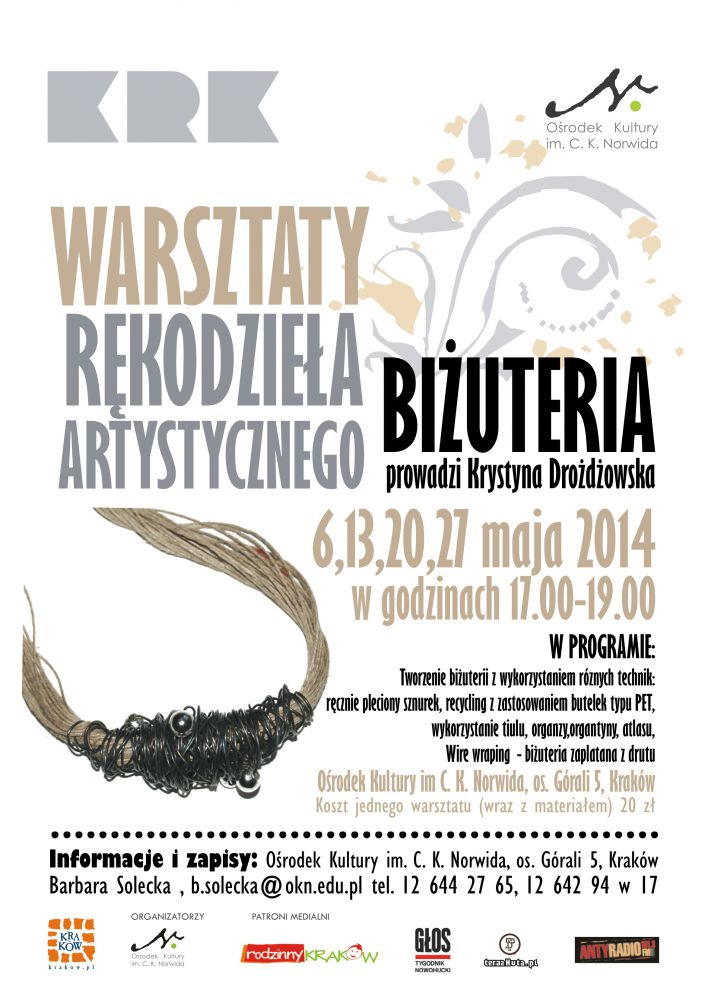 Warsztaty odbywajš się we wtorki, w godzinach 17.00-19.00, prowadzi Krystyna Drożdżowska. Koszt pojedynczych zajęć 20 zł.