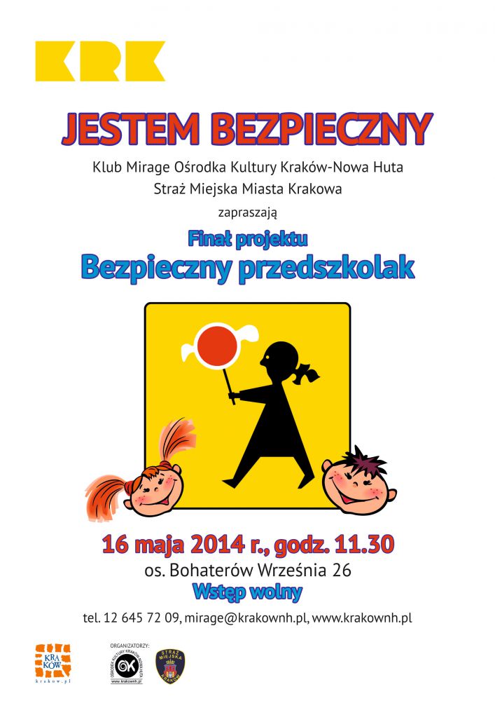 Finał projektu Bezpieczny Przedszkolak, organizowanego przez Klub Mirage Oœrodka Kultury Kraków-Nowa Huta (os. Bohaterów Wrzeœnia 26) wspólnie ze Strażš Miejskš Miasta Krakowa. Podczas zajęć 16 maja o godz. 11.30 przedszkolaki wezmš udział w konkursie wiedzy o bezpieczeństwie, który będzie podsumowaniem dotychczasowych spotkań dotyczšcych problematyki bezpieczeństwa. Będš musiały wykazać się m.in. znajomoœciš zasad ruchu drogowego, wiedzš na temat pracy strażnika miejskiego oraz właœciwego reagowania w sytuacjach zagrożenia.