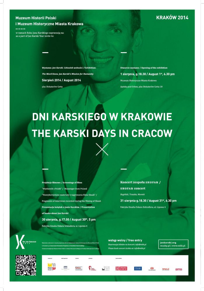 • 30 sierpnia, g. 17.00 - projekcje filmów: "Wysłannik z Polski" i "Niewykorzystane fragmenty z nagrywania filmu Shoah"), prezentacja ksišżek o Janie Karskim, Fabryka Emalia Oskara Schindlera, ul. Lipowa 4