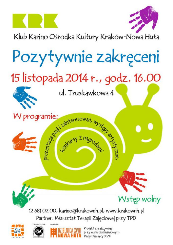 Pozytywnie zakręceni to nasi sšsiedzi, o których często tak mało wiemy, to także ci, którzy swój wolny czas poœwięcajš na pracę na rzecz innych lub oddajš się wyjštkowemu hobby. W imprezie weŸmie udział także młodzież z Warsztatów Terapii Zajęciowej. W programie spotkania prezentacja pasji i zainteresowań, występy artystyczne, konkursy i zabawy z nagrodami. Impreza finansowana jest ze œrodków Rady Dzielnicy XVIII Nowa Huta.