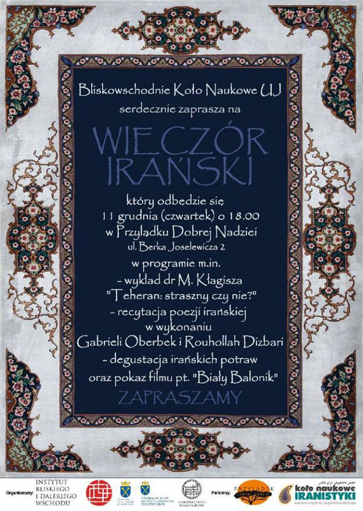 Bliskowschodnie Koło Naukowe UJ zaprasza Państwa na Wieczór Irański, który odbędzie się 11 grudnia o godzinie 18.00 w Przylšdku Dobrej Nadziei.