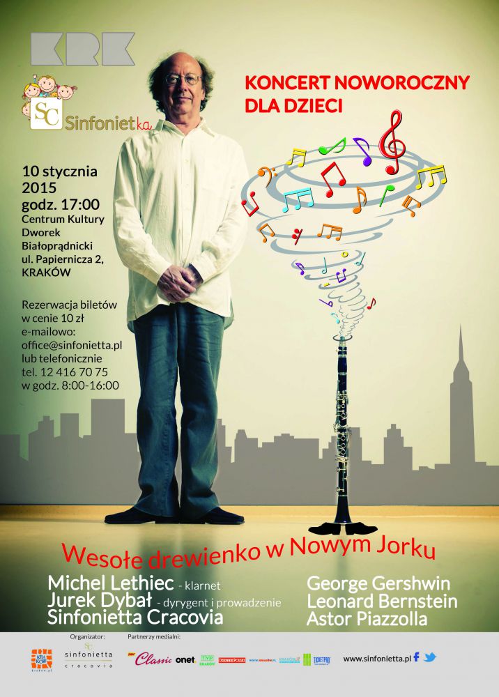 Kto powiedział, że koncerty noworoczne sš tylko dla dorosłych? W sobotę, 10 stycznia, Sinfonietta Cracovia zagra w Dworku Białopršdnickim pierwszy koncert z nowego cyklu dla dzieci SINFONIETKA pt. Wesołe drewienko w Nowym Jorku". Udział w nim wemie wiatowej sławy francuski klarnecista Michel Lethiec.