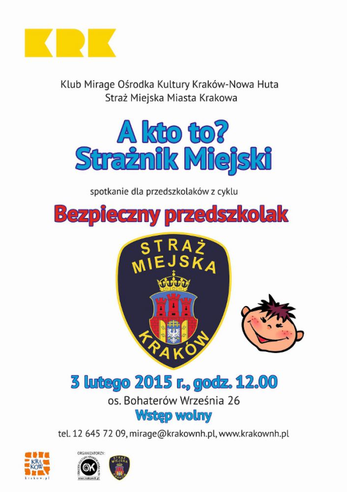 Klub Mirage Oœrodka Kultury Kraków-Nowa Huta zaprasza na spotkanie dla przedszkolaków prowadzone przez Straż Miejskš w ramach cyklu Bezpieczny przedszkolak. Dzieci dowiedzš się, na czym polega praca Strażnika Miejskiego, w jakich sytuacjach trzeba skontaktować się ze Strażš Miejskš i pod jakim numerem telefonu. Strażnicy zaprezentujš umundurowanie i sprzęt służbowy a dzięki interaktywnej planszy oraz zabawom logicznym będš mogły w praktyczny sposób utrwalić zdobytš wczeœniej wiedzę.