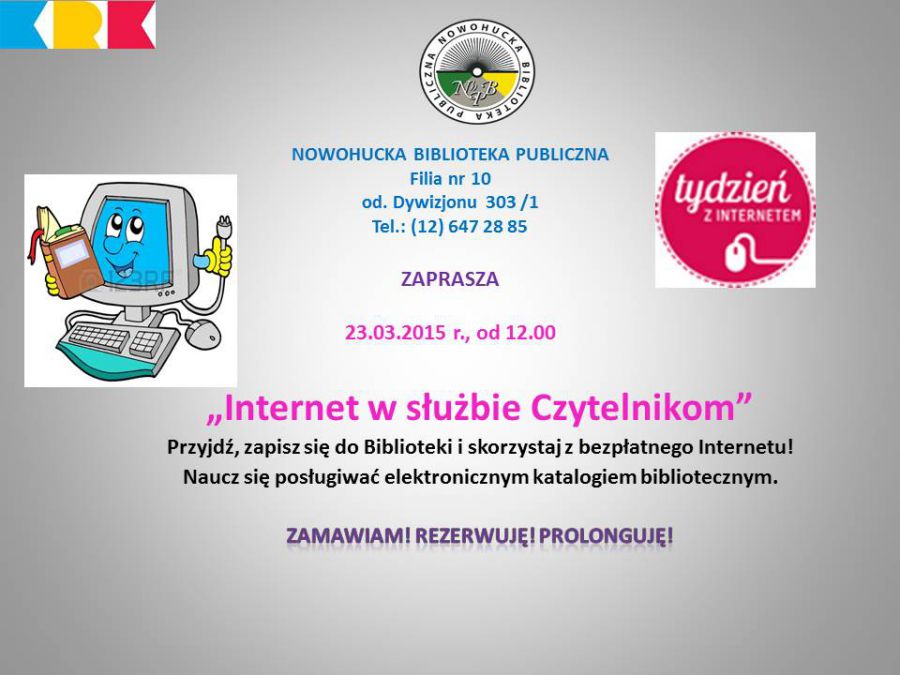 „Internet w służbie Czytelnikom”, czyli Tydzień z Internetem w Filii nr 10. PrzyjdŸ, zapisz się do Biblioteki, skorzystaj z bezpłatnego Internetu. Naucz się posługiwać elektronicznym katalogiem bibliotecznym i poznaj jego zawartoœć, dowiedz się, jak zamówić i zarezerwować ksišżkę oraz jak jš prolongować on-line.