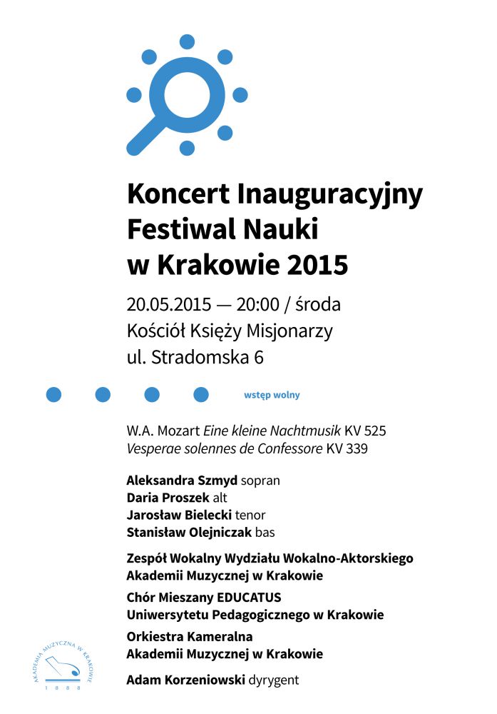 Zawsze chętnie słuchana i powszechnie rozpoznawalna muzyka W.A. Mozarta wypełni wnętrze koœcioła księży Misjonarzy przy ul. Stradomskiej 6 w œrodę 20 maja o godzinie 20:00. W ramach XV Festiwalu Nauki podczas koncertu inauguracyjnego wystšpiš: Aleksandra Szmyd – sopran, Daria Proszek – alt, Jarosław Bielecki – tenor, Stanisław Olejniczak – bas, Zespół Wokalny Wydziału Wokalno-Aktorskiego, Chór Mieszany EDUCATUS Uniwersytetu Pedagogicznego w Krakowie oraz Orkiestra Kameralna Akademii Muzycznej w Krakowie. Całoœć poprowadzi Adam Korzeniowski. Wstęp wolny.
