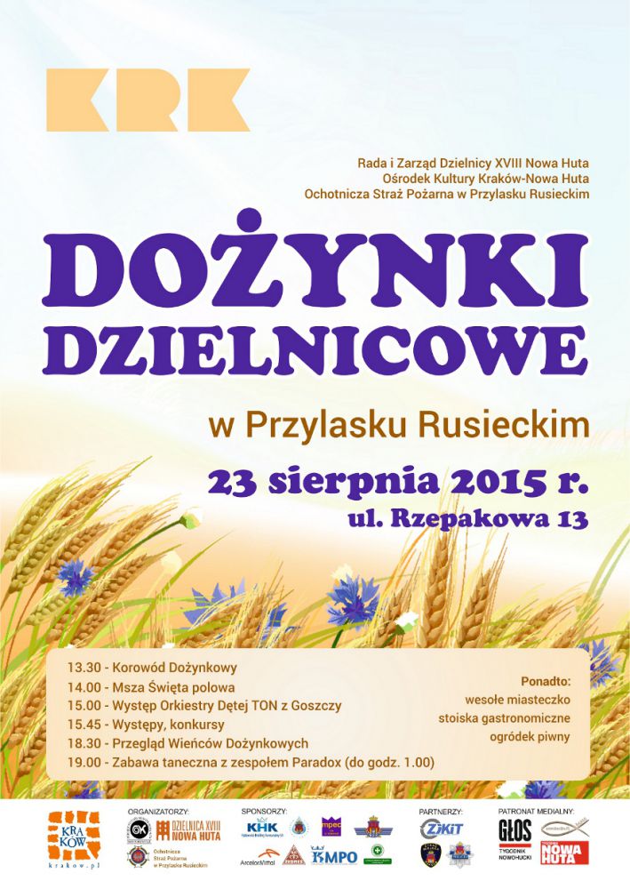 Tradycjš sš obchodzone w całym kraju, końcem sierpnia każdego roku œwięta plonów. Podtrzymujšc ten zwyczaj, Rada i Zarzšd Dzielnicy XVIII Nowa Huta, Oœrodek Kultury Kraków-Nowa Huta oraz Ochotnicza Straż Pożarna w Przylasku Rusieckim zapraszajš na tegoroczne Dożynki Dzielnicowe, które odbędš się w niedzielę 23 sierpnia w Przylasku Rusieckim (ul. Rzepakowa 13). W nowohuckich osiedlach wcišż wielu mieszkańców posiada swoje własne pola i zajmuje się rolnictwem, a organizowane œwięto plonów jest ukłonem w ich stronę za trud, który wkładajš w swojš pracę.