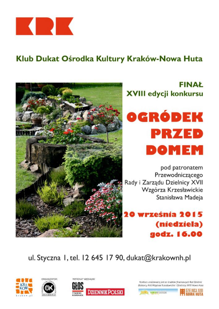 Klub Dukat Orodka Kultury Kraków-Nowa Huta (ul. Styczna 1) zaprasza 20 wrzenia o godz. 16.00 na Finał konkursu Ogródek przed Domem. Podczas imprezy finałowej nastšpi odczytanie werdyktu Jury i wręczenie nagród. Spotkaniu towarzyszyć będzie wernisaż pokonkursowej wystawy fotograficznej. Na wszystkich uczestników czeka specjalnie przygotowany poczęstunek w ogrodzie Klubu Dukat.