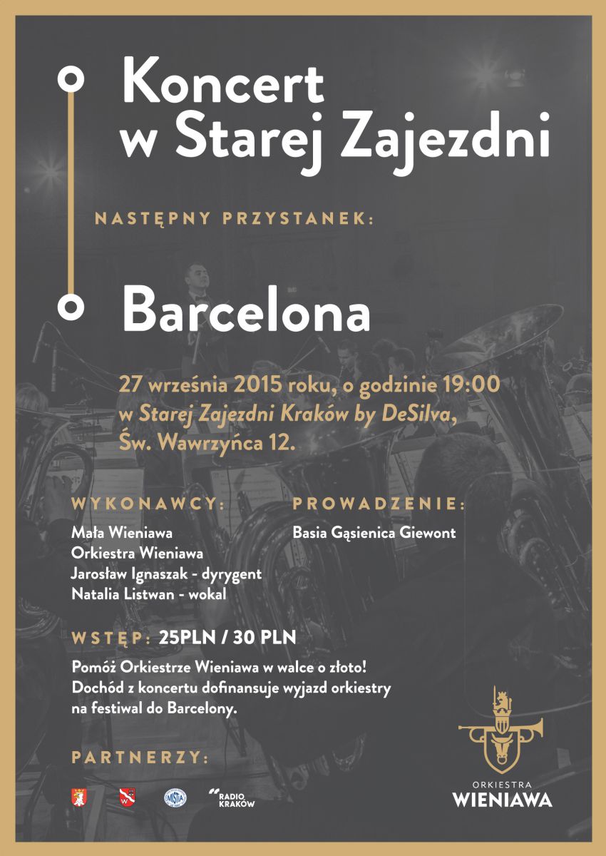 W ubiegłym roku Orkiestra Wieniawa wraz z liczšcš prawie 800 osób widowniš obchodziła Jubileusz 20-lecia. Po tym wydarzeniu Wieniawa otrzymała 13 zaproszeń na festiwale międzynarodowe – od Portugalii po Chiny. Orkiestra zdecydowała się reprezentować Polskę na prestiżowym Międzynarodowym Festiwalu w Barcelonie. Dochód z biletów przeznaczony zostanie na dofinansowanie festiwalowego wyjazdu do stolicy Katalonii. Pomóż Wieniawie w walce o złoto!