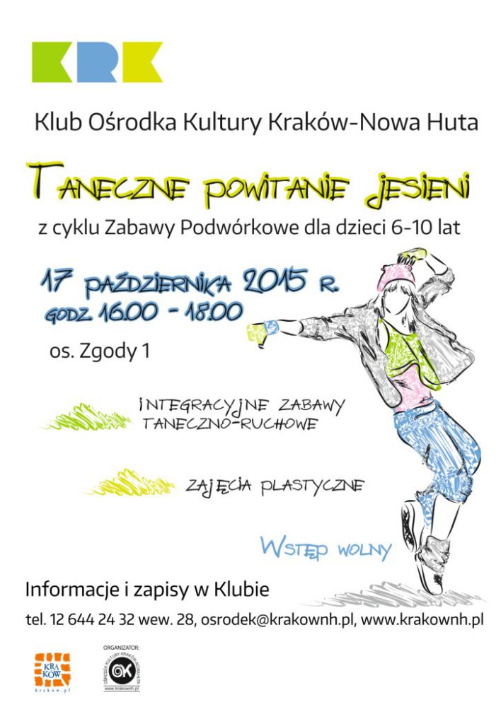 Celem kolejnego spotkania z cyklu Zabawy podwórkowe organizowanego przez Klub Orodka Kultury Kraków-Nowa Huta (os. Zgody 1) jest kształtowanie wrażliwoci estetycznej, poczucia piękna przyrody wród najmłodszych oraz zaangażowanie dzieci do udziału w konkursach, zabawach integracyjnych i zajęciach plastycznych, których tematem będzie Pani Jesień oraz pejzaże jesienne. W przypadku ładnej pogody będziemy malować pejzaże jesienne kredš na asfalcie przed Klubem. Na imprezę 17 padziernika w godz. 16-18 zapraszamy rodziny z dziećmi w wieku od 6 do 10 lat do wspólnego miłego spędzenia wolnego czasu w sobotnie popołudnie.