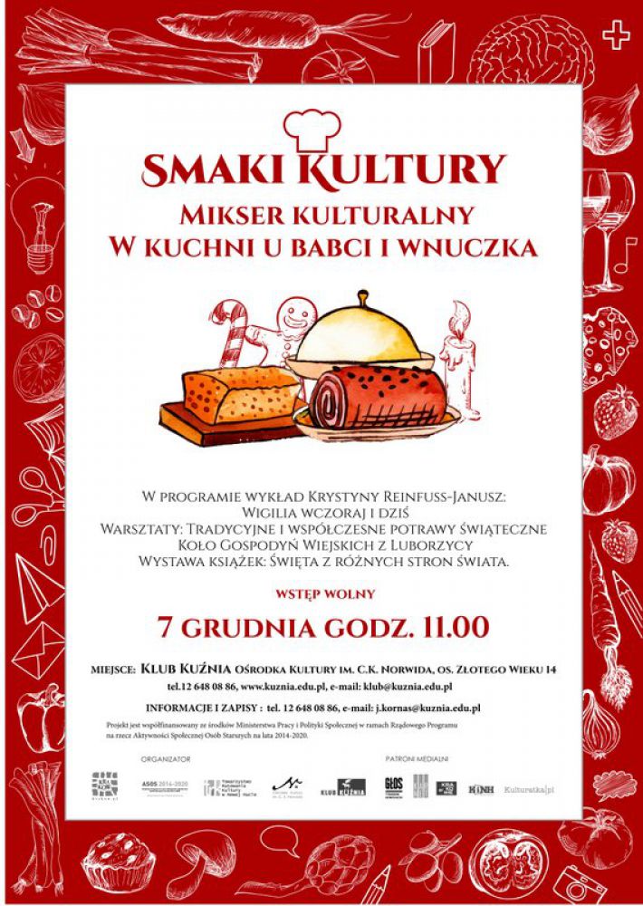 Smaki kultury to międzypokoleniowy projekt, łšczšcy starszych i młodszych pasjonatów kultury i sztuki kulinarnej. Wspólnie realizowane spotkania, będš miejscem dialogu, inspirujšcej rozmowy, wspólnego gotowania, wymiany myli, wiedzy i przepisów kulinarnych. Projekt ma na celu integrację wewnštrz i międzypokoleniowš w oparciu o kulturę, literaturę i film.