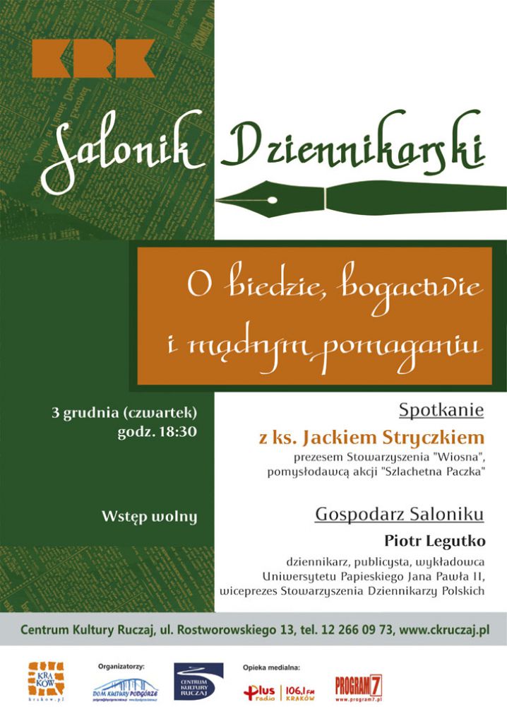 Spotkanie odbędzie się w ramach Saloniku Dziennikarskiego - comiesięcznych spotkań i dyskusji z ciekawymi osobowociami, celebrytami, politykami i znanymi ekspertami. Gospodarz, Piotr Legutko, rozmawia z goćmi o ich pracy, opiniach, a także o sytuacji w kraju i na wiecie oraz o teraniejszoci i przyszłoci Krakowa. W dyskusji biorš też udział widzowie.