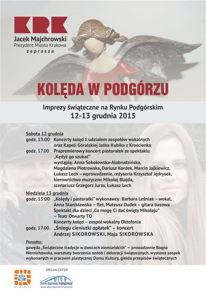 W pierwszym dniu, w sobotę 12 grudnia o godz. 17.00 odbędzie się prapremiera koncertu pastorałek z musicalu Kędyż Go szukać. Pastorałki znane i całkiem nowe łšczy jedna myl poszukiwanie Boga narodzonego w Betlejem i w sobie. Wystšpiš: Anna Sokołowska, Ala Brudzińska, Magdalena Piotrowska, Marcin Jajkiewicz, Łukasz Lech (wprowadzenie). Natomiast w niedzielę, 13 grudnia o godz. 17.00, impreza zakończy się z koncertem kolęd i pastorałek niegu cieniutki opłatek w wykonaniu Andrzeja Sikorowskiego i Mai Sikorowskiej.