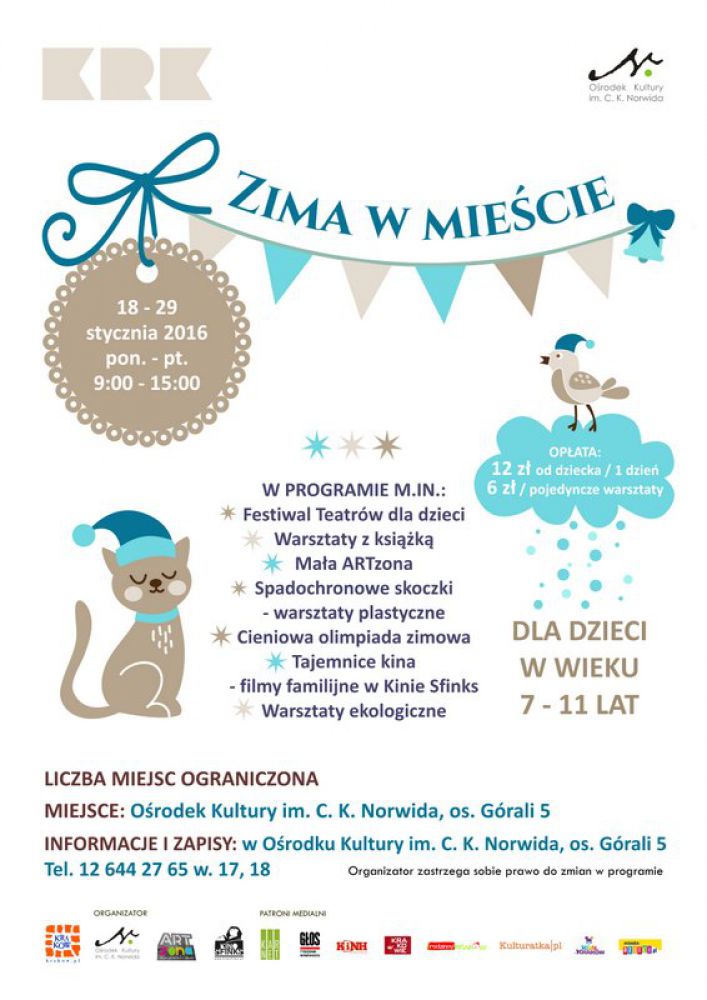 Orodek Kultury im C. K. Norwida serdecznie zaprasza na Zimowe warsztaty, czyli kolejnš odsłonę cyklu zajęć dla dzieci w czasie małopolskich ferii zimowych 2016.