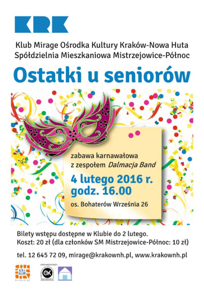 Koniec karnawału to tradycyjnie okres, w którym seniorzy z Klubu Mirage Orodka Kultury Kraków-Nowa Huta (os. Bohaterów Wrzenia 26) hucznie się bawiš. 4 lutego o godz. 16.00 zapraszamy na karnawałowy wieczorek taneczny przy muzyce na żywo. Do tańca przygrywać będzie zespół Dalmacja Band, który umili wieczór dobrš muzykš oraz wspaniałym humorem. Jako, że impreza odbędzie się w tłusty czwartek nie zabraknie słodkich pšczków, które zgodnie z tradycjš majš zapewnić tłuste i bogate życie przez najbliższy rok. Zapisy w Klubie do 2 lutego.