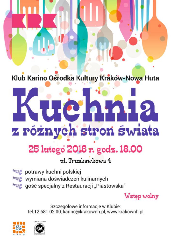 Kuchnia z różnych stron wiata, to nowy cykl spotkań w Klubie Karino Orodka Kultury Kraków-Nowa Huta (ul. Truskawkowa 4) dla kobiet w każdym wieku. Spotkania odbywać się będš raz w miesišcu. Pierwsze odbędzie się 25 lutego o godz. 18.00 i powięcone będzie potrawš kuchni polskiej - konkretnie kurczakowi w jarzynach.