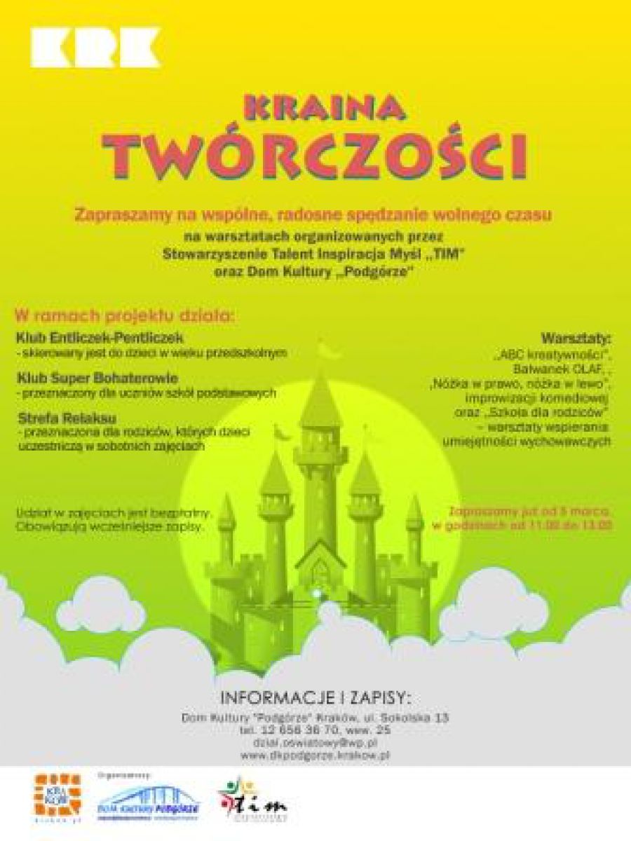 KRAINA TWÓRCZOCI - Jest to projekt, który zapewni dzieciom i ich rodzicom radosne spędzenie wolnego czasu na warsztatach organizowanych przez Stowarzyszenie Talent Inspiracja Myl ,,TIM" oraz Dom Kultury ,,Podgórze". Projekt wyzwoli w dzieciach kreatywnoć, pobudzi wyobranię, odkryje ukryte talenty i rozwinie pasje. Spotkania organizowane sš w dwie soboty miesišca.