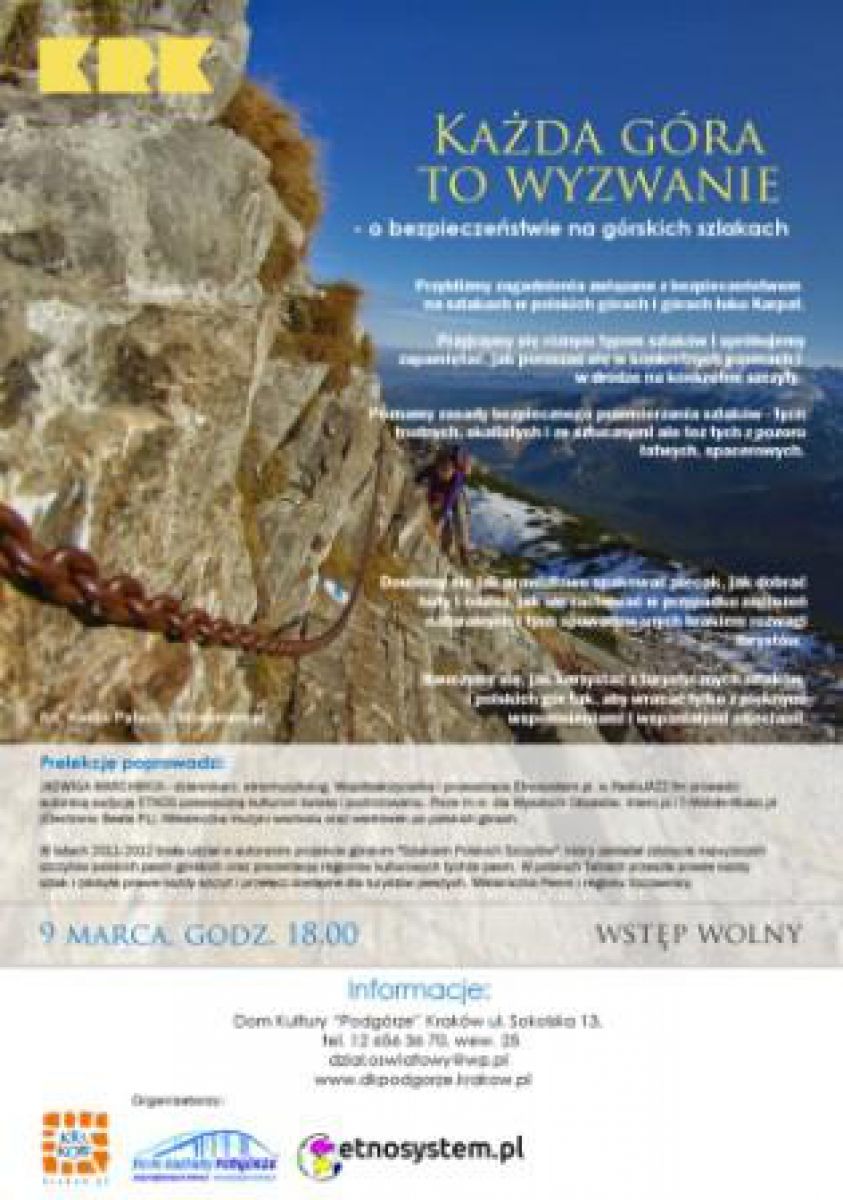 Prelekcja "Każda góra to wyzwanie" skierowana jest do osób w każdym wieku i o różnym stopniu zaznajomienia z tematem górskich wycieczek. Uzupełniona będzie o zadania praktyczne oraz pokazy zdjęć i filmów redakcji Etnosystem.pl.