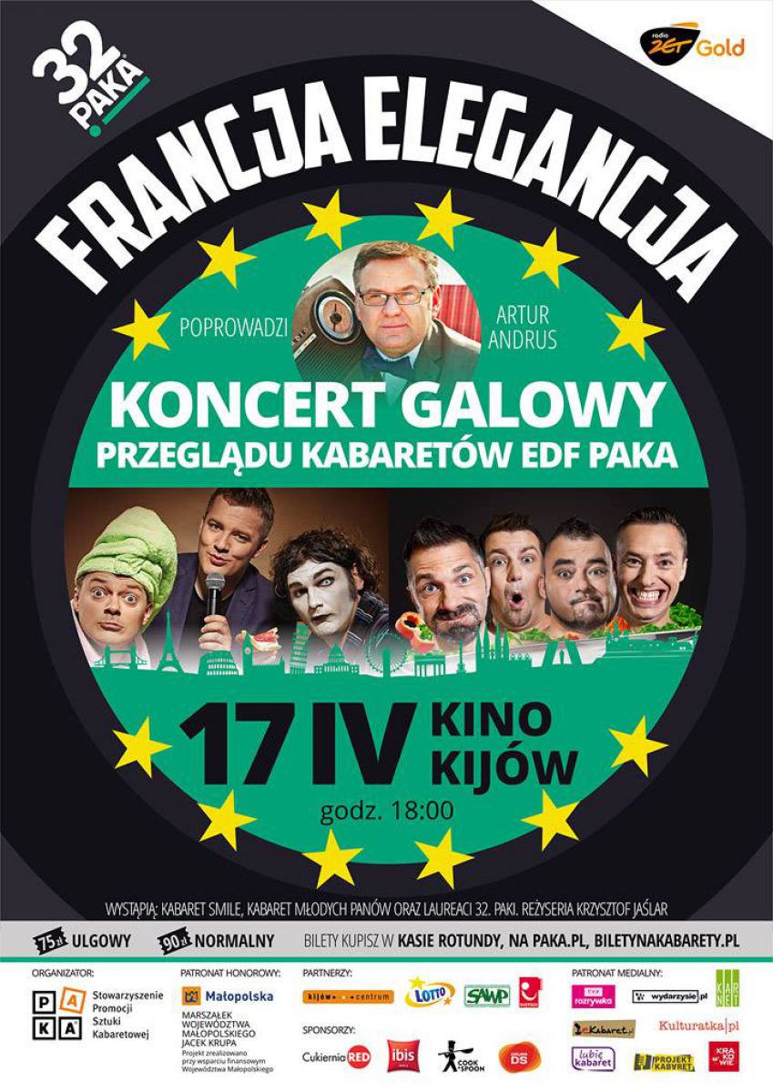 Paryski szyk na scenie Kina Kijów zaprezentujš, więtujšcy niedawno dziesięciolecie działalnoci Kabaret Młodych Panów i bijšcy rekordy popularnoci Kabaret Smile. Obok nich laureaci tegorocznej PAKI pokażš się w zwycięskich numerach i specjalnie przygotowanych na tę okazję skeczach. Pieczę nad całociš sprawować będzie Krzysztof Jalar reżyser od lat zwišzany z PAKĽ, za cały koncert poprowadzi znany ze stylu i klasy Artur Andrus. Serce miejšcej się Europy bije w Krakowie na PACE!