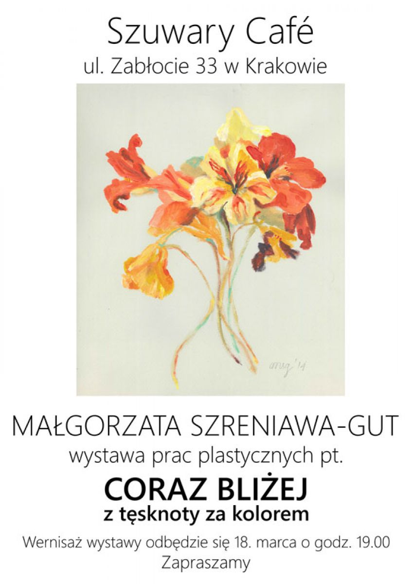 Szuwary Cafe (ul. Zabłocie 33) zaprasza w pištek (18.03) o godz. 19.00 na wernisaż wystawy prac plastycznych Małgorzaty Szreniawy-Gut „Coraz bliżej. Z tęsknoty za kolorem”, wstęp wolny,