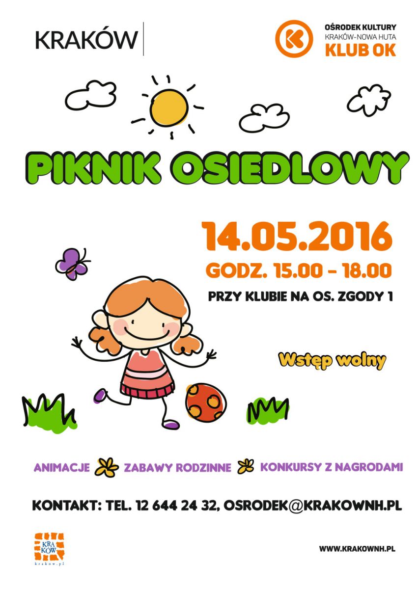 Piknik osiedlowy przy klubie na os. Zgody 1 to doskonały sposób na spędzanie wolnego czasu w gronie rówieników, sšsiadów, rodzin z dziećmi. Zachęca do aktywnoci fizycznej na wieżym powietrzu, a także do wspólnych rozmów. Podczas pikniku, który odbędzie się 14 maja w godzinach od 15:00 do 18:00, organizowanego przez Klub Orodka Kultury Kraków-Nowa Huta dzieci będš mogły wzišć udział w warsztatach plastycznych, w konkurencjach sportowych: rzucie do kosza, wycigach w workach czy kręglach. Będzie też puszczanie baniek mydlanych i skręcanie baloników oraz malowanie buziek a na najmłodszych czekać będzie kšcik plastyczny. Atrakcjš będš zabawy z chustš animacyjnš. Rodzice będš mogli też pobawić się razem z dziećmi, oraz zagrać w gry stolikowe.