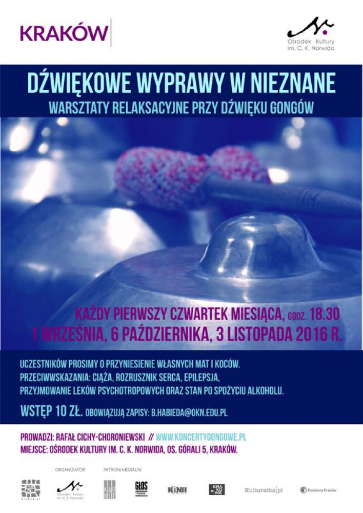 Uczestników prosimy o przyniesienie własnych mat i koców, na których będzie można się położyć i w pełni skorzystać z działania dwięku.