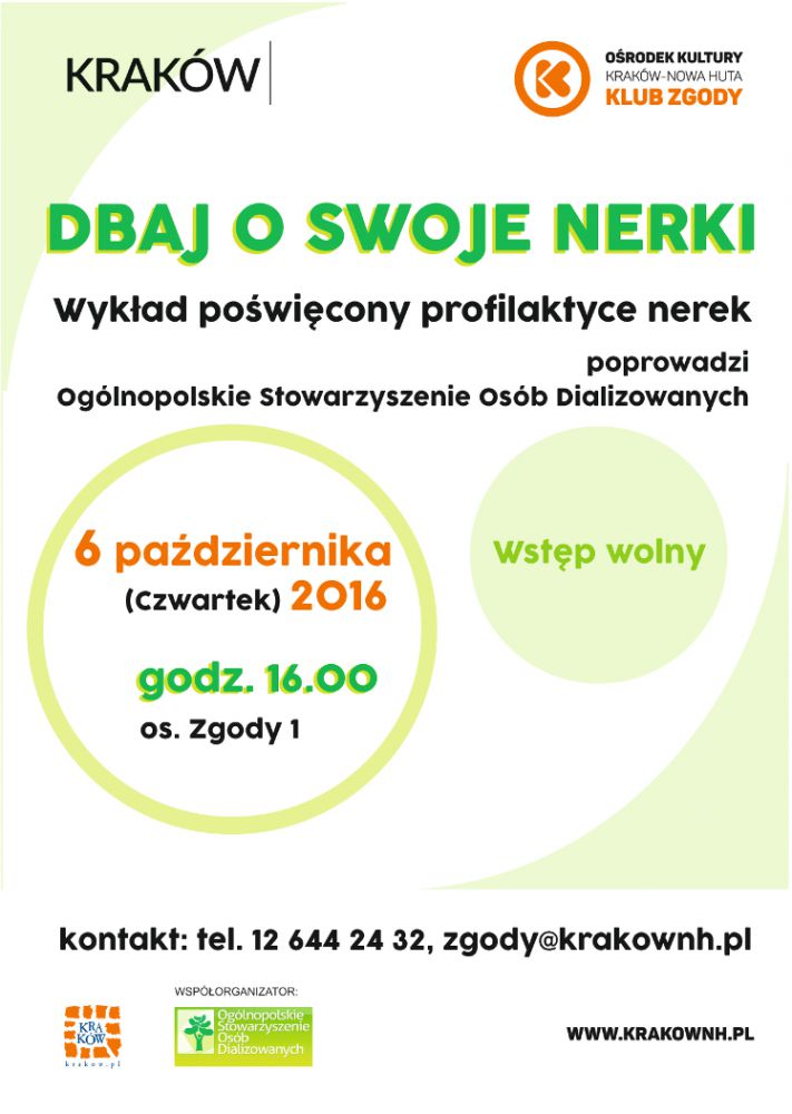 Klub Zgody Orodka Kultury Kraków-Nowa Huta (os. Zgody 1) zaprasza 6 padziernika na godz. 16.00 na spotkanie pt. Dbaj o swoje nerki. Spotkanie polegać będzie na pracy zespołowej, które poprowadzi Ogólnopolskie Stowarzyszenie Osób Dializowanych, które podczas spotkania przybliży problem rozwoju Przewlekłej Choroby Nerek oraz opowie jak utrzymać nerki w dobrej kondycji i zmniejszyć ryzyko zachorowania. Stowarzyszenie od 2004 r. zrzesza osoby dializowane, po przeszczepie oraz ich rodziny z całej Polski. W ramach prowadzonej działalnoci edukuje i wspiera pacjentów z Przewlekłš Chorobš Nerek, promuje profilaktykę chorób nerek oraz ideę transplantacji, jako najlepszš metodę ratowania życia ciężko chorych osób.