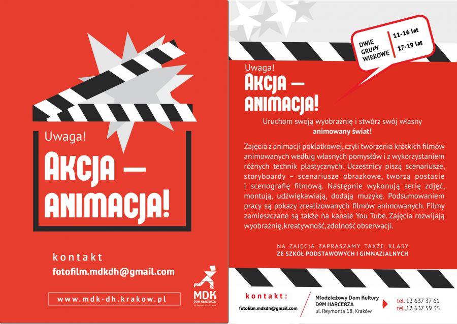 Uczestnicy piszš scenariusze, tworzš storyboardy scenariusze obrazkowe, postacie i scenografię filmowš. Następnie wykonujš serię zdjęć, montujš, udwiękawiajš, dodajš muzykę. Podsumowaniem pracy sš pokazy zrealizowanych filmów animowanych. Filmy zamieszczane sš także na kanale You Tube. Zajęcia rozwijajš wyobranię, kreatywnoć,zdolnoć obserwacji i budowania spójnego opowiadania. Warsztaty odbywajš się w każdy czwartek od godziny 15.15 do 17.45.