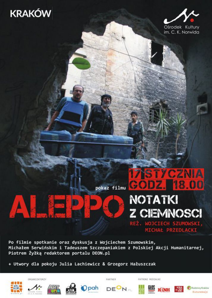 ALEPPO. NOTATKI Z CIEMNOŒCI. Pokaz filmu Wojciecha Szumowskiego i Michała Przedlackiego. Film jest unikalnym, jednak przede wszystkim wstrzšsajšcym, zapisem życia miasta widzianego z perspektywy szeœciu jego mieszkańców, zrealizowanym przez 44 dni latem 2013 roku. Pokaz będzie wstępem do dyskusji na temat obecnej sytuacji mieszkańców Syrii, w której wezmš udział osoby zaangażowane w niesienie pomocy w tej częœci œwiata Michał Serwiński i Tadeusz Szczepaniak z Polskiej Akcji Humanitarnej oraz Piotr Żyłka, redaktor naczelny portalu DEON, organizator akcji "TAK dla pomocy Syryjczykom". Na koniec wydarzenia Julia Lachiewicz & Grzegorz Hałuszczak wykonajš utwory Boba Dylana i Joan Baez. Podczas spotkania za poœrednictwem Polskiej Akcji Humanitarnej prowadzona będzie zbiórka publiczna na pomoc rodzinom syryjskim. (Misja Polskiej Akcji Humanitarnej w Syrii prowadzi działania w 50 obozach dla uchodŸców wewnętrznych na terenie prowincji Idlib i Aleppo, gdzie obejmuje systematycznš pomocš ok. 35 tys. osób.)